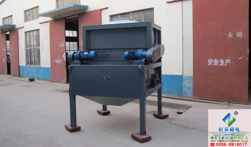其運行原理是物料經料倉落入勻速給料裝置,通過給料裝置將物料在沒有進入磁選區之前,用振動的方式對物料和磁性物質通過重力和振動,使粘連或包裹的磁性物質基本實現分散狀態。并能夠均勻的送到磁選區域,在設備的磁選區受到重力和磁場力的作用下,利用物料的磁性差異有不同的運動軌跡實現分離,磁性礦物被吸附在磁輥表面旋轉到達精礦區,毛刷將吸附在磁輥表面上的磁性礦刷脫。